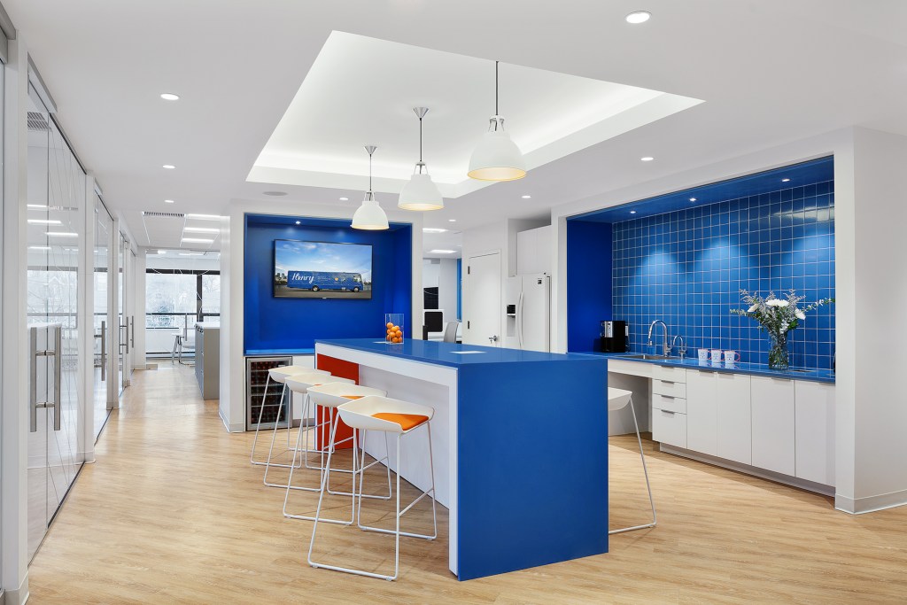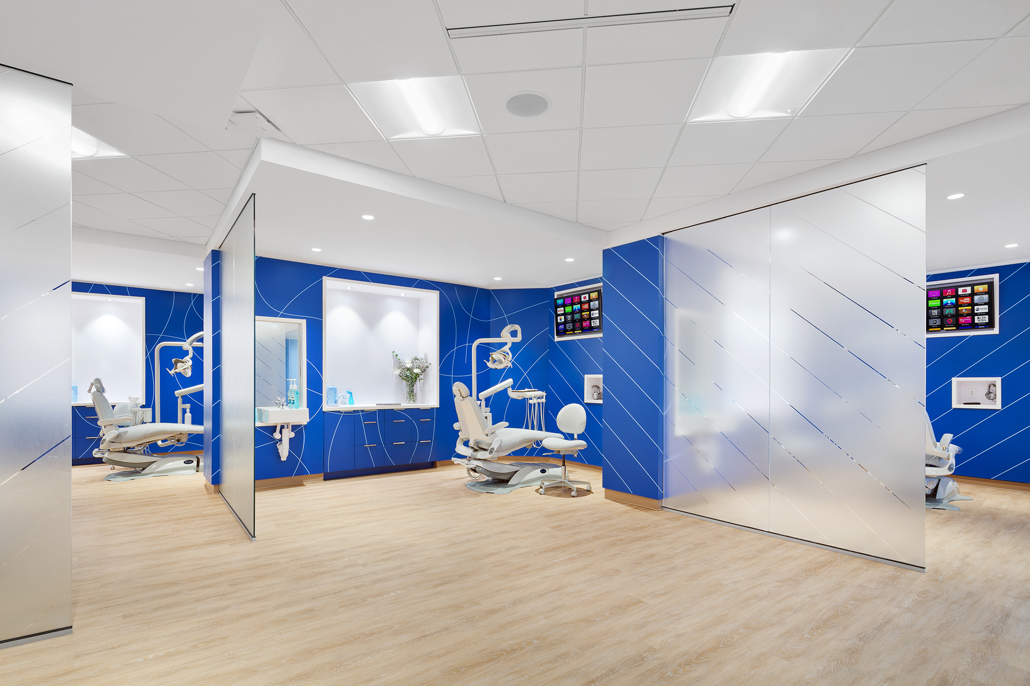 From the moment a patient enters the clinic reception area, Henry’s core mission is clearly reinforced – this is not your parents’ dentist office and the experience has been improved at every step. The reception area includes easily accessible stations to get headphones, drinks and snacks, as well as carefully curated retail items. The treatment areas are larger and expanded versions of the mobile pods – private, individualized, semi-open rooms carefully crafted with patient driven amenities like Netflix and HBO streaming TV’s, noise-cancelling headphones, in-room sinks and convenient spaces for personal belongings and phone charging. Equal design attention was given to the details on the dental side with state-of-the-art equipment organized to efficiently support great service and treatments. On the office side, the space was designed to promote creativity and collaboration with glass-fronted private offices, open desking, flexible conference spaces and a larger central “kitchen” and lounge for informal meetings and office-wide gatherings.