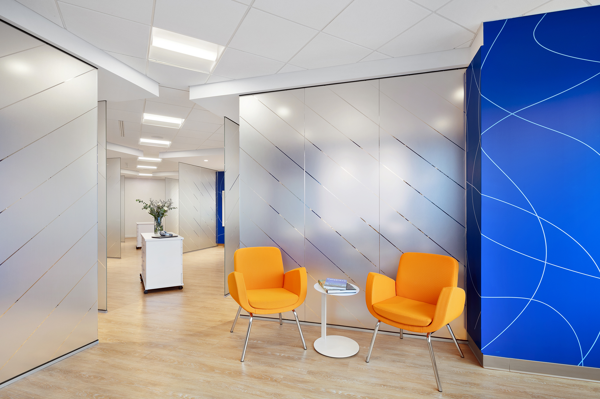 We love partnering with a client who is intentionally trying to disrupt an industry and create something entirely new and ownable. While we were able to successfully achieve this in the unique mobile environment, the challenge was to bring that same feeling of surprise and delight to the more familiar clinic setting. To achieve this, we replaced the typically bland and boxy treatment rooms with angled and glass partitions and utilized a material palette of warm wood tones and bright, brand colors not usually found in clinical environments. Overall, the design is carefully calibrated to project both a high level of established professional expertise, as well as the warm, welcoming nature of the brand. The same general palette is woven through the adjacent office spaces to reinforce the important continuity and connection between the corporate planning and patient facing work of the company.