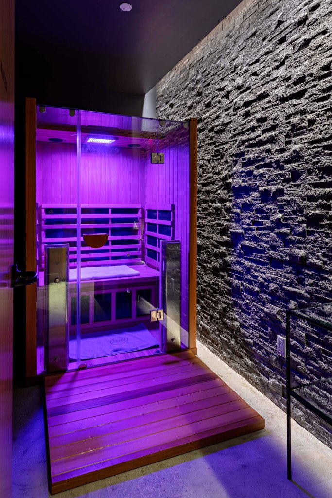 with LED grazers. The red cedar sauna units provide color therapy via color