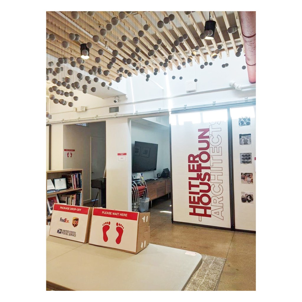 Our implementations start right when you exit the elevator (HHA is an open concept office space so the divisions between employees and others is critical). Once you get off the elevators and enter into the office, there is a defined drop-off and pick-up location for mail and deliveries to minimize interactions and the amount of traffic through the office. This creates a clear barrier between the employees and essential workers which can be seen below.