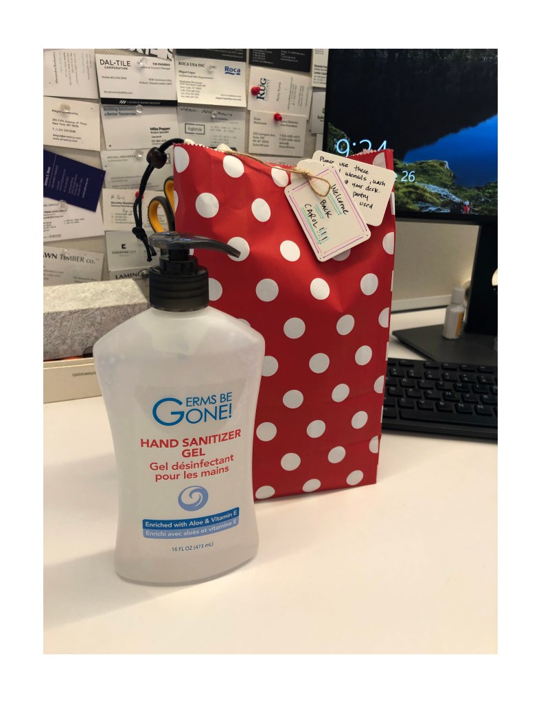 Once back at their own desk, each employee was given a “Welcome Back” package, which can be seen below, to the left. These packages contained hand sanitizer for their personal workspace, a face mask to be worn when not at their immediate workstation, personal eating utensils, vitamin shots and some snacks. Not only is it important to keep your “home base” clean but there were also Sanitizing Stations placed around the office at high traffic areas and touchpoints. Besides the restrooms, our Materials Library is another high touchpoint location. As you can see from the photo on the right, we have placed a variety of cleaning products for surfaces and gloves to be used when working the material samples.